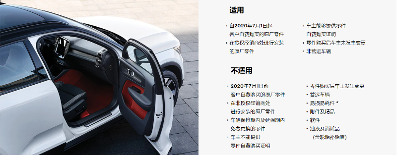 去年,沃爾沃發(fā)布了“讓安全,更周全”的服務(wù)理念,核心內(nèi)容包括零件終身保、預(yù)約快速養(yǎng)、免費(fèi)取送車、超長時營業(yè)、尊享代步車、全天候守護(hù)六大服務(wù)承諾。其中“零件終身保”是沃爾沃在豪華車品牌中率先提出的。自2020年7月1日起,在車主不變更的情況下,但凡車主自費(fèi)在沃爾沃授權(quán)經(jīng)銷商購買安裝原廠指定零件,在車主不變更的情況下,該配件出現(xiàn)任何問題(非外力因素?fù)p壞),沃爾沃會提供終身免費(fèi)保修,免去用戶后顧之憂。不僅可以降低車輛的維修使用成本,同時也提高了消費(fèi)者用車安全。