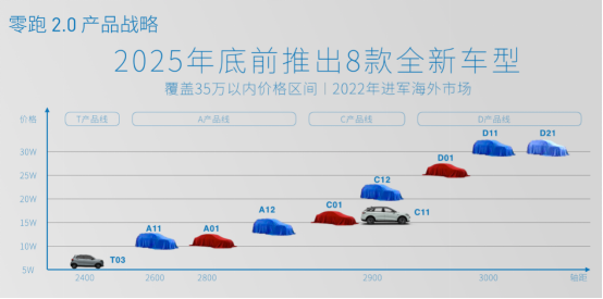 為了達(dá)成這個(gè)目標(biāo),零跑汽車將在 2025 年底前推出 8 款車型,覆蓋35萬(wàn)以內(nèi)的價(jià)格區(qū)間,2022年進(jìn)軍海外市場(chǎng)。在技術(shù)布局上,零跑目標(biāo)是在智能化領(lǐng)域三年內(nèi)超越特斯拉。