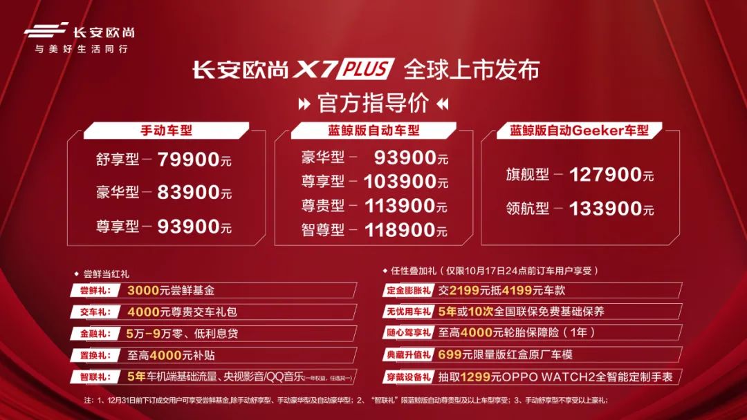 10月17日,長安歐尚X7PLUS迎來了正式上市的重要時刻,新車推出1.5T+6MT和1.5T+7DCT兩種動力組合共計9款車型,官方指導(dǎo)售價為7.99萬元至13.39萬元。