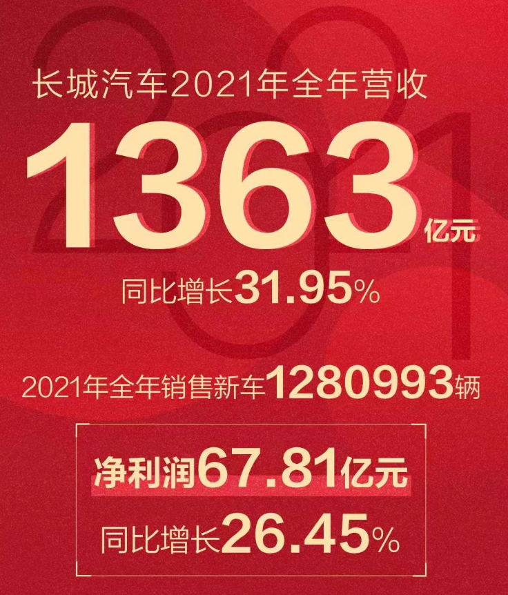 汽車信息網(wǎng)1月24日訊 1月23日,長城汽車股份有限公司(股票代碼:601633.SH,02333.HK;以下簡稱長城汽車)發(fā)布2021年業(yè)績快報(bào),2021年年報(bào)預(yù)計(jì)將于3月30日對外發(fā)布??靾?bào)顯示長城汽車去年?duì)I業(yè)總收入1363.17億元,同比增長31.95%,凈利潤67.81億元,同比增長26.45%,單車平均售價(jià)超過10.64萬元,同比增長14.50%。