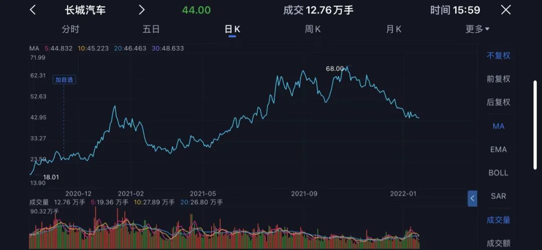 從股價(jià)走勢來看,長城汽車在A股市場,去年10月26日達(dá)到69.8元的新高后,在大量網(wǎng)友看高至100元高價(jià)時(shí)。長城汽車一路下滑,截止至上周五以44元收盤,跌幅超過36%,已經(jīng)接近2021年的開盤價(jià)格,也就是說如果你在2021年開年買入長城汽車,沒有在69.8的高點(diǎn)套現(xiàn)的話,持有的收益大幅縮水。但如果你是2020年開年買入長城汽車的話,那收益還是相當(dāng)可觀的。
