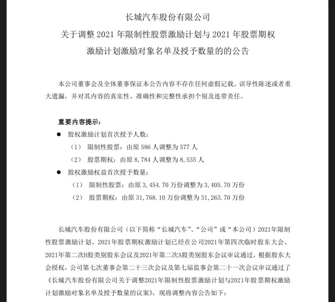 長城汽車的業(yè)績表現(xiàn)除了會(huì)影響股民的收益外,也關(guān)乎大量長城汽車員工的切身利益。長城汽車在去年進(jìn)行了大規(guī)模的員工股權(quán)激勵(lì),其中577人拿到了公司限制性股票、8535人拿到了股票期權(quán)。給予員工對應(yīng)的獎(jiǎng)勵(lì)之外,長城汽車也制定了相應(yīng)的考核目標(biāo)。