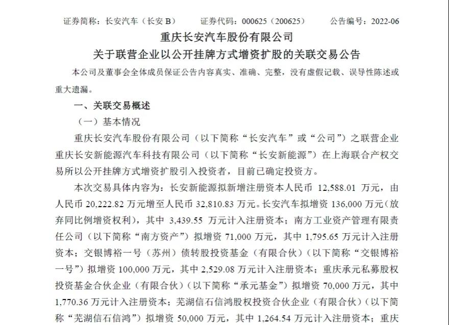根據(jù)長安汽車發(fā)布的公告顯示,長安新能源本次增資共募集資金約49.77億元,擬新增注冊資本約1.26億元,即由2.02億元增至約3.28億元。