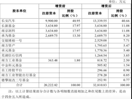本次增資完成后,長安汽車的持股比例由此前的48.95%唄稀釋到40.66%,交銀博裕一號持股7.71%,南方資產(chǎn)持股5.47%,承元基金持股5.40%,蕪湖信石信鴻持股3.85%,南方工業(yè)基金持股比例由1.80%增至2.50%,中金科元基金持股1.54%,員工持股平臺持股0.90%,南方工業(yè)智能出行基金持股0.85%,德擎混改二號基金持股0.77%。