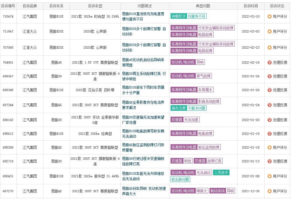 除了終端表現(xiàn)乏力,思豪品牌自身也存在著不少關(guān)于產(chǎn)品質(zhì)量方面的問題。通過車質(zhì)網(wǎng)查詢,“汽扯扒談”發(fā)現(xiàn)思皓品牌無論新能源車型,還是燃油車吹牛皮,多存在著諸多投訴。