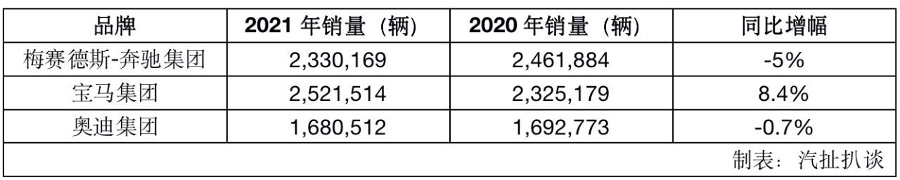 來自官方的數(shù)據(jù)顯示,在過去的2021年,奔馳、寶馬、奧迪三家除了寶馬收獲了8.4%的銷量增長(zhǎng)之外,另外兩家銷量都有不同程度的銷量下滑。其中,梅賽德斯-奔馳乘用車和輕型商務(wù)車總銷量為2,330,169輛,同比下降5%,這源于缺芯的影響。