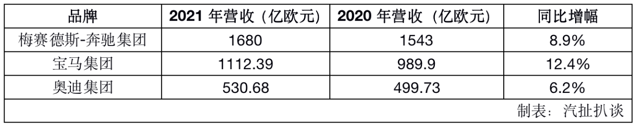 從官方發(fā)布的數(shù)據(jù)來說,奔馳、寶馬、奧迪三家2021年?duì)I收都有小幅的上漲。其中梅賽德斯-奔馳集團(tuán)營(yíng)業(yè)額達(dá)1,680億歐元,同比增長(zhǎng)8.9%。寶馬集團(tuán)營(yíng)收1112.39億歐元,同比增長(zhǎng)最高,達(dá)到12.4%,原因在于寶馬銷量小幅上漲。而奧迪集團(tuán)營(yíng)收530.68億歐元,同比增長(zhǎng)6.2%。