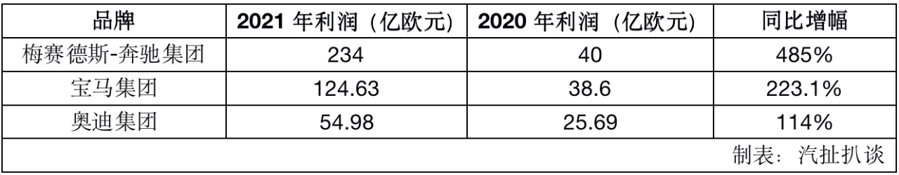 而利潤(rùn)表現(xiàn)上,奔馳、寶馬、奧迪都收獲翻倍的增幅,其中梅賽德斯-奔馳集團(tuán)表現(xiàn)十分強(qiáng)勁,2021年凈利潤(rùn)達(dá)234億歐元,同比2021年增長(zhǎng)高達(dá)485%。寶馬集團(tuán)凈利潤(rùn)124.63億歐元,同比增長(zhǎng)223.1%。奧迪集團(tuán)略遜色一些,營(yíng)業(yè)利潤(rùn)54.98億歐元,同比增長(zhǎng)114%。