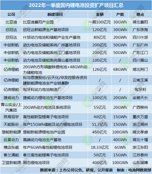 (2022年一季度國內(nèi)鋰電池投資擴(kuò)產(chǎn)項(xiàng)目匯總)