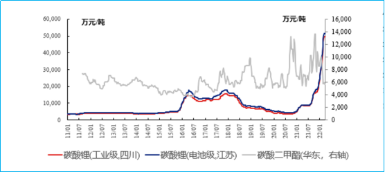 以上一輪鋰周期為例,受中國電動車的爆發(fā)與震蕩,以及海外鋰資源+國內(nèi)鋰鹽廠的受限與擴(kuò)張影響,鋰價從2015年上漲,最高達(dá)到17.5萬元/噸的高價,在2016年到2017年保持高位震蕩格局,2018年到2019年隨著新能源政策的退坡,鋰礦產(chǎn)能的大幅度釋放,鋰價一路下跌至4萬元/噸。本輪鋰價周期則始于2020三季度,目前仍處于上漲階段。