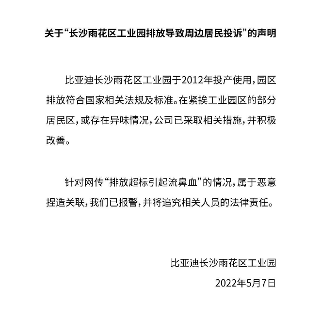 5月7日晚間,比亞迪發(fā)布官方聲明表示已經(jīng)報(bào)警處理。比亞迪在聲明中稱:比亞迪長(zhǎng)沙雨花區(qū)工業(yè)園于2012年投產(chǎn)使用,園區(qū)排放符合國(guó)家相關(guān)法規(guī)及標(biāo)準(zhǔn)。在緊挨工業(yè)園區(qū)的部分居民區(qū),或存在異味情況,公司已采取相關(guān)措施,并積極改善。針對(duì)網(wǎng)傳“排放超標(biāo)引起流鼻血”的情況,屬于惡意捏造關(guān)聯(lián),我們已報(bào)警,并將追究相關(guān)人員的法律責(zé)任。