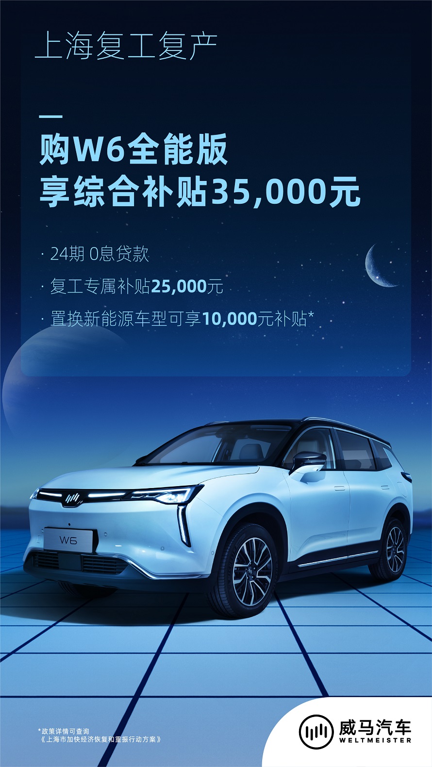6月1日-7月1日,凡上海用戶購(gòu)買威馬W6全能版,即可享受復(fù)工專屬補(bǔ)貼25000元和24期0息貸款。如果用戶置換威馬W6全能版,還可享受10000元政府補(bǔ)貼,即最高可享綜合補(bǔ)貼35000元。