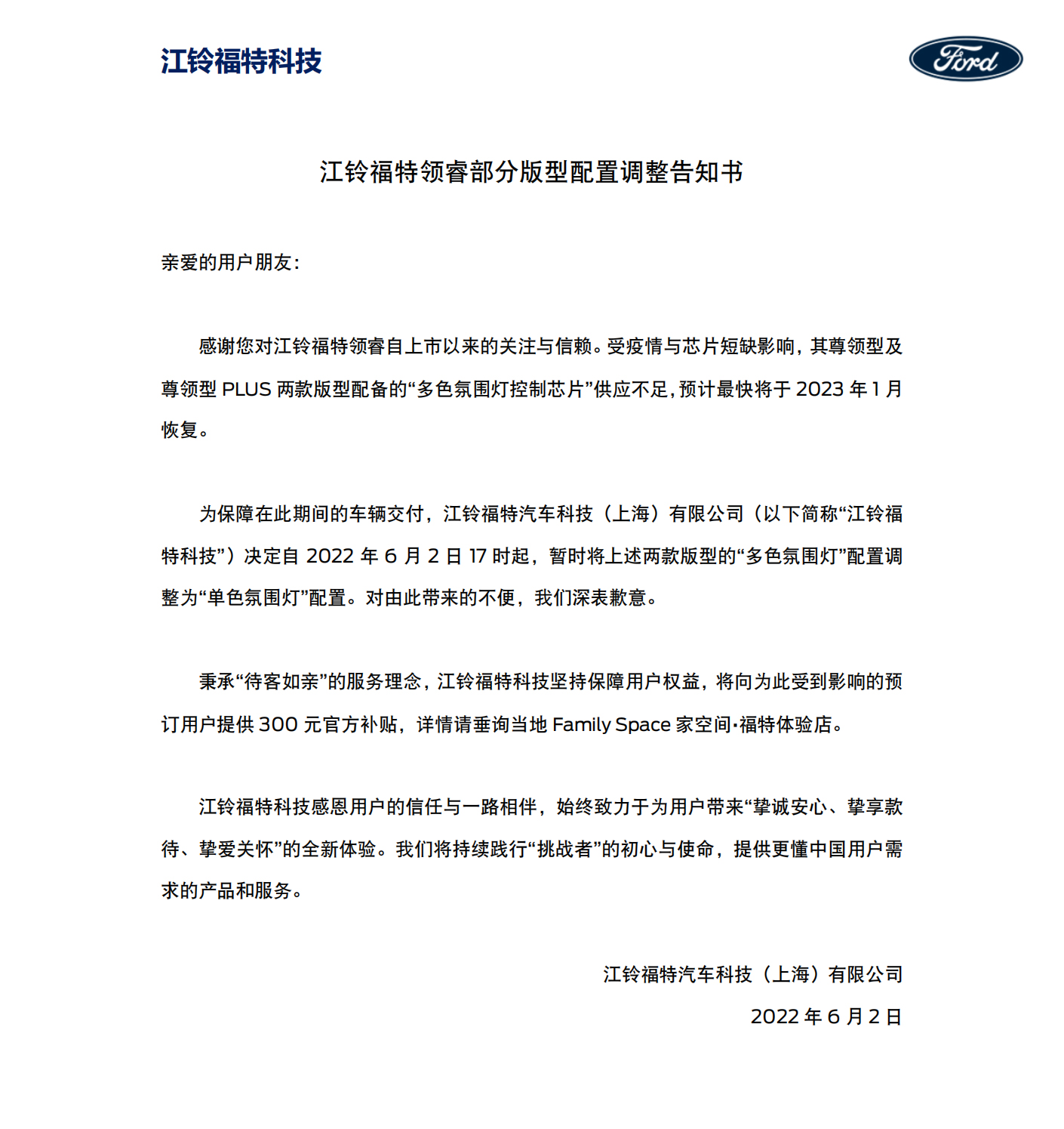為保障在此期間的車輛交付,江鈴福特決定自2022年6月2日17時起,暫時將上述兩款版型的“多色氛圍燈”配置調(diào)整為“單色氛圍燈”配置。江鈴福特將向為此受到影響的預(yù)訂用戶提供300元官方補貼,詳情請垂詢當(dāng)?shù)谾amily Space家空間·福特體驗店。