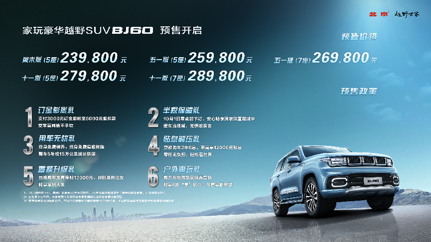 北京越野BJ60自今年3月首次曝光以來,以開創(chuàng)性的“家玩”定位、將越野與舒適豪華劃等號的決心而備受關(guān)注、熱議不斷。本屆車展,BJ60正式開啟預(yù)售,預(yù)售價格23.98萬元,相較之前業(yè)界普遍揣測的25萬區(qū)間更具吸引力。發(fā)布會現(xiàn)場還公布了BJ60預(yù)售專屬福利,包括訂金膨脹禮、半稅保障禮、用車無憂禮、貼息解壓禮、置換升級禮、戶外惠玩禮共六重優(yōu)惠大禮,綜合折算價格超過6萬元,使BJ60更具誠意,令越野和舒適的距離近在咫尺,讓更多的中國家庭玩得更酷。
