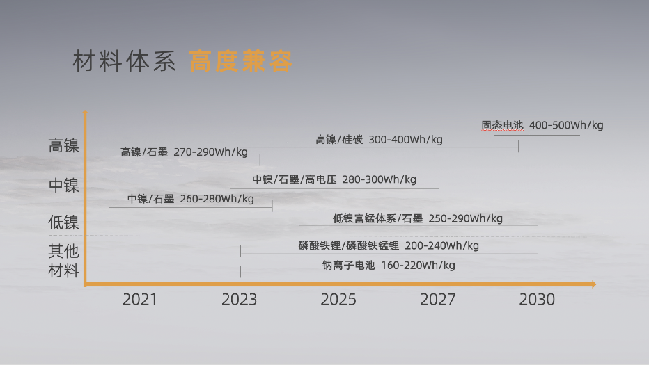 鈉離子電池、磷酸鐵鋰、磷酸錳鐵鋰等計(jì)劃在2023年推出第一代產(chǎn)品,目標(biāo)是到2030年將鈉離子電池能量密度從160Wh/kg提升到220Wh/kg,磷酸鐵鋰和磷酸錳鐵鋰的能量密度形成從200Wh/kg到240Wh/kg的產(chǎn)品覆蓋。在低鎳方面,孚能科技計(jì)劃在2024年推出250Wh/kg的低鎳富錳體系產(chǎn)品,預(yù)計(jì)在2030年進(jìn)一步提高至290Wh/kg。