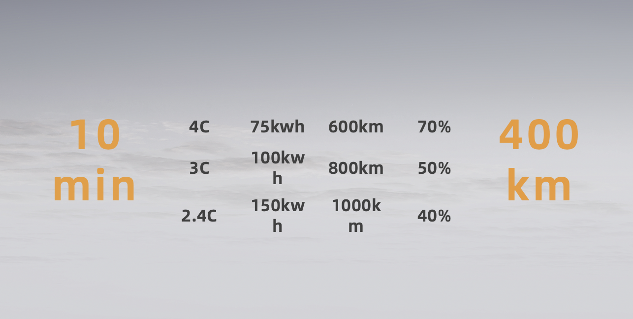 孚能科技展示了2.4C、3C和4C三種倍率快充電芯,對(duì)應(yīng)帶電量150kWh、100kWh和75kWh,對(duì)應(yīng)續(xù)航里程1000km、800km和600km,充電10分鐘補(bǔ)能40%、50%和70%,分別實(shí)現(xiàn)400km、400km和560km的續(xù)航里程。