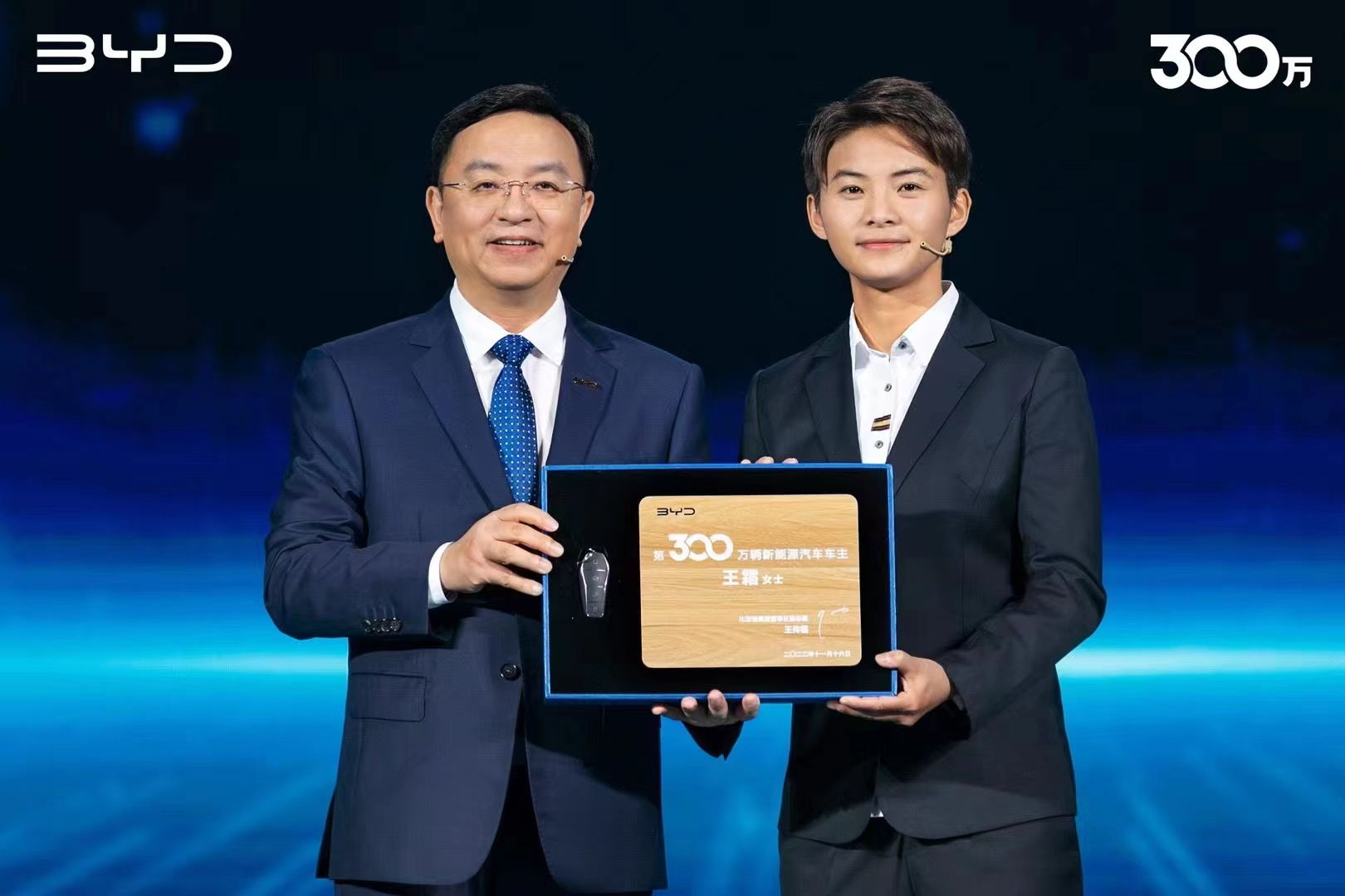 2022年11月16日,比亞迪迎來第300萬輛新能源汽車下線,成為首個達(dá)成這一里程碑的中國品牌。這一天,亞洲足球小姐王霜成為比亞迪第300萬輛新能源汽車的車主。