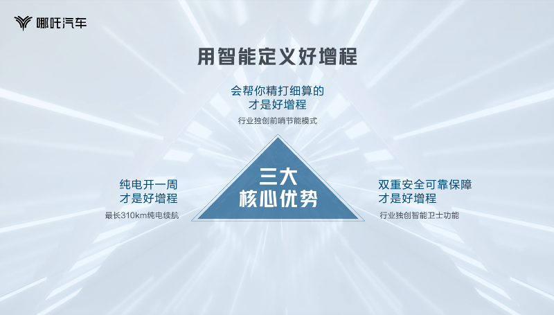 哪吒S優(yōu)勢(shì)之一是加持高效三合一增程器,通過(guò)四種工作模式、提升用車體驗(yàn)。電動(dòng)用戶出行,最擔(dān)心的就是動(dòng)力電池“罷工”或者對(duì)續(xù)航里程預(yù)估失誤而造成的出行“趴窩”。哪吒S的增程系統(tǒng)為了給用戶構(gòu)建零焦慮的全場(chǎng)景用車,擁有純電、增程驅(qū)動(dòng)+電池充電、增程+電池共同驅(qū)動(dòng)四種工作原理,可油可電的組合滿足了用戶在不同場(chǎng)景下的動(dòng)力需求,帶來(lái)了智能無(wú)憂、放心好省的電動(dòng)出行體驗(yàn)。