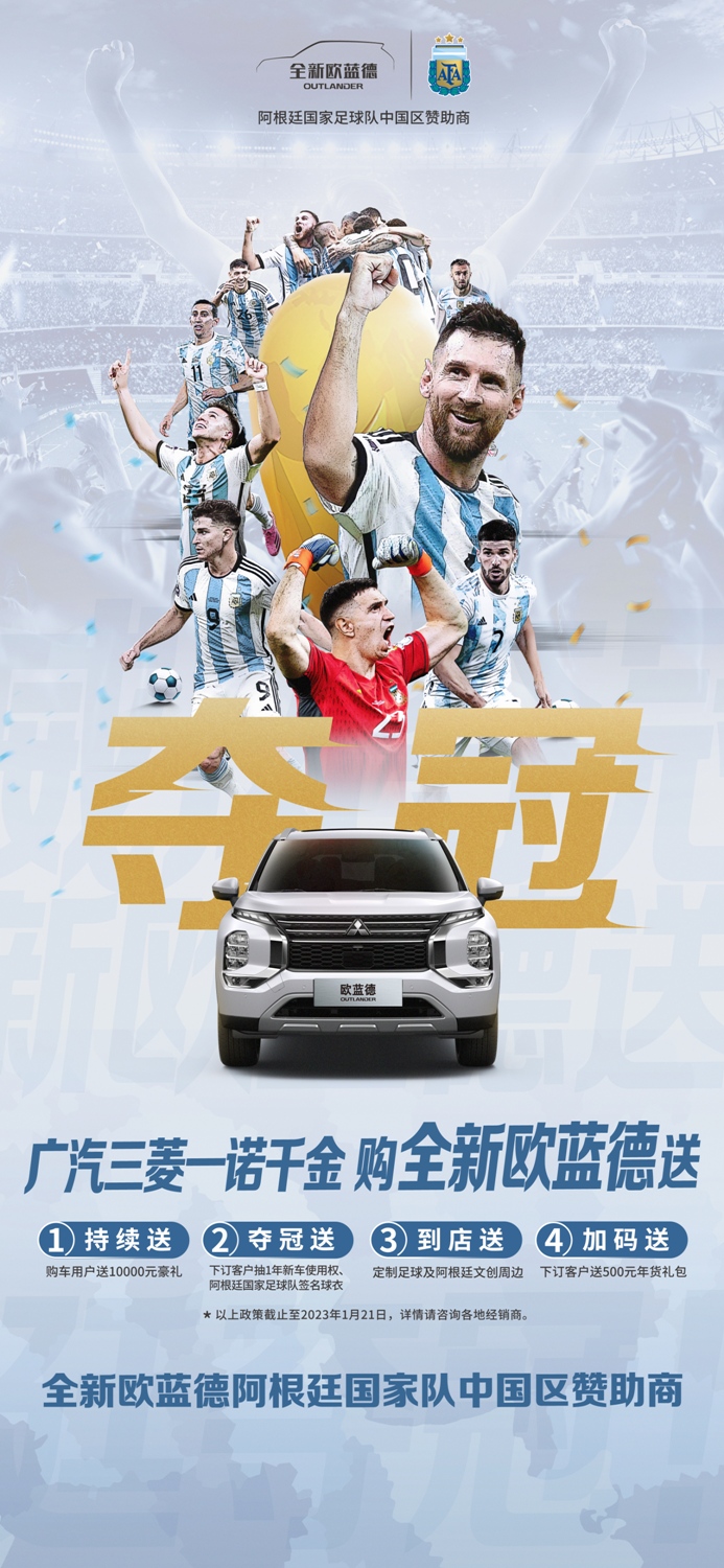 不久前,全新歐藍(lán)德以16.98 -22.98萬(wàn)元的指導(dǎo)價(jià)上市,在本屆車展現(xiàn)場(chǎng)舉行“全新歐藍(lán)德首任車主交車儀式”。如今,全新歐藍(lán)德已在全國(guó)各地陸續(xù)交付。作為阿根廷國(guó)家足球隊(duì)中國(guó)區(qū)贊助商,廣汽三菱全新歐藍(lán)德為祝賀阿根廷奪冠還推出了購(gòu)車加碼福利。車友們只需在春節(jié)前(2023年1月21日)成交提車,即可享受以下四重權(quán)益(具體權(quán)益詳情請(qǐng)咨詢各地經(jīng)銷商)。