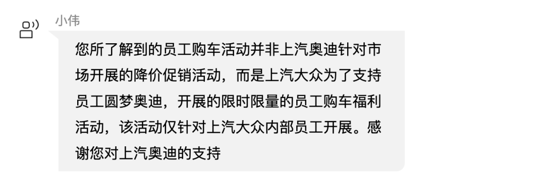 對于是否有員工倒賣內(nèi)部購買資格的疑問,客服人員表示:“如果我們發(fā)現(xiàn)販賣或倒賣員工購車資格的話,會一追到底,嚴(yán)格按照公司內(nèi)部流程進(jìn)行處理。”另外,就網(wǎng)傳“上汽奧迪的新車賣不動了,讓員工來消化”的疑問,該工作人員表示否認(rèn)。不過,對于市場傳聞上汽奧迪相關(guān)車型內(nèi)部優(yōu)惠幅度,官方并沒有給予肯定回應(yīng),相關(guān)價格僅作為參考。