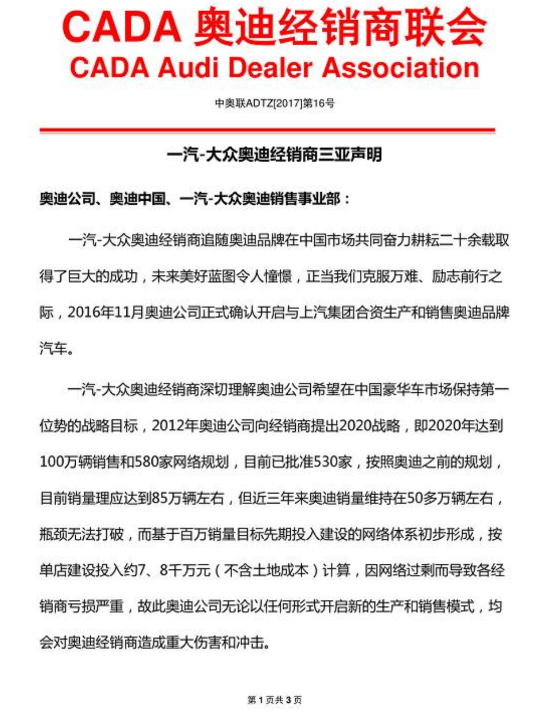 2017年2月,中國汽車流通協(xié)會奧迪經(jīng)銷商聯(lián)會對外發(fā)布《三亞聲明》,表達(dá)兩個意思:第一,反對奧迪與上汽集團(tuán)合作;第三,想另起爐灶可以,先達(dá)成2020年100萬銷量;為了平息中國經(jīng)銷商怒火,大眾集團(tuán)直接解聘奧迪全球市場和銷售董事馮德睿(Dietmar Voggenreiter)。