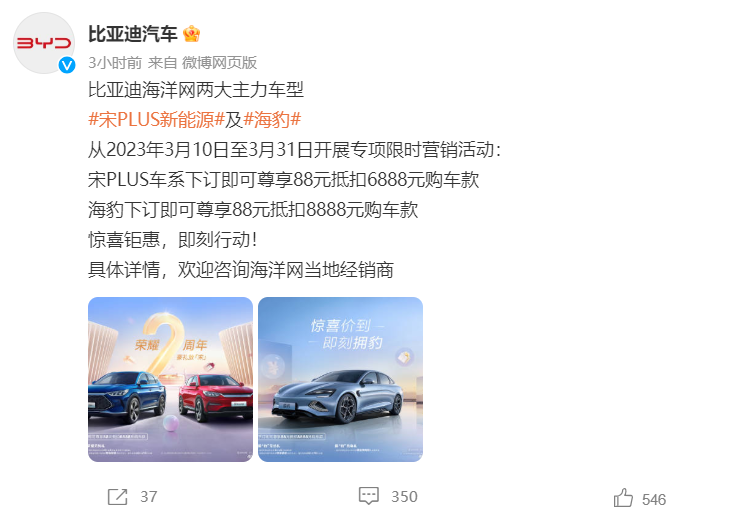 3月9日,比亞迪官方宣布3月10日至3月31日,比亞迪兩大主力車型開展專項限時營銷活動:宋PLUS車系下訂即可享88元抵扣6888元購車款;海豹下訂即可享88元抵扣8888元購車款,相當(dāng)于變相減8800元。