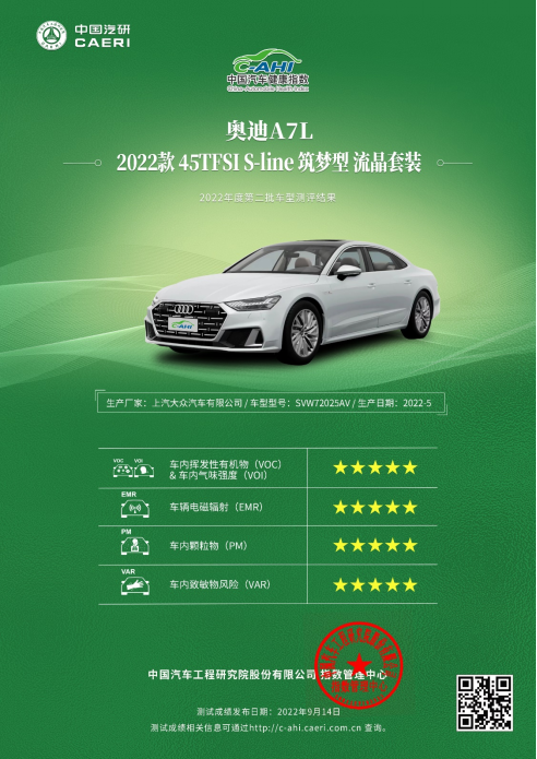 在“健康中國2030”的國家戰(zhàn)略大背景下,健康汽車聯(lián)合研究中心聯(lián)合中國汽車健康指數(shù)(C-AHI)推出“五星健康車”認證標識,以應對中國汽車消費市場們對車內(nèi)環(huán)境品質(zhì)提出的更高的要求。在中國汽車健康指數(shù)(C-AHI)2022年第二批次車型的測評結(jié)果中,上汽奧迪A7L在各測評板塊均獲得五星成績,為消費者購車提供重要參考。