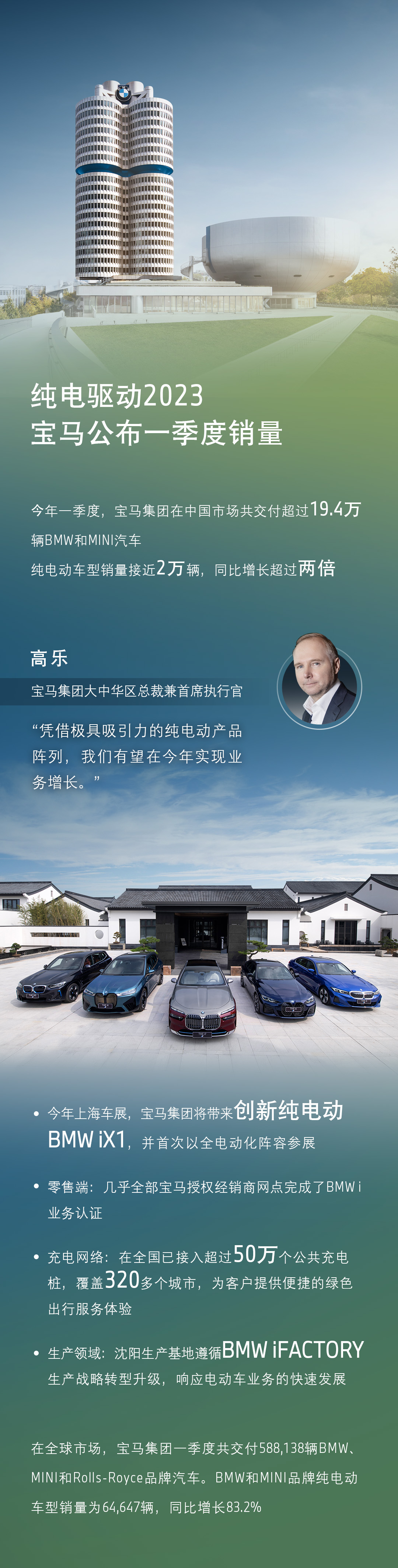 寶馬集團(tuán)大中華區(qū)總裁兼首席執(zhí)行官高樂表示:“今年第一季度,中國汽車市場波動依然存在,雖然展廳客流量呈現(xiàn)上升趨勢,但汽車消費(fèi)尚未完全恢復(fù)。我們注意到,一系列穩(wěn)定市場、提振消費(fèi)信心的舉措陸續(xù)推出,這些利好消息將有助于拉動市場增長。在此背景下,憑借極具吸引力的純電動產(chǎn)品陣列,我們有望在今年實現(xiàn)業(yè)務(wù)增長。“
