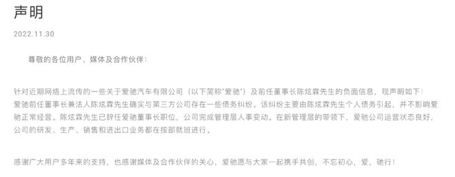 這也直接導(dǎo)致其卸任愛(ài)馳汽車(chē)董事長(zhǎng)之職,盡管愛(ài)馳汽車(chē)發(fā)表聲明陳炫霖確實(shí)存在債務(wù)糾紛,但并不影響愛(ài)馳正常經(jīng)營(yíng)。但作為愛(ài)馳的投資人,顯然對(duì)于愛(ài)馳的融資產(chǎn)生不小的影響,尤其是當(dāng)下的投資環(huán)境下。