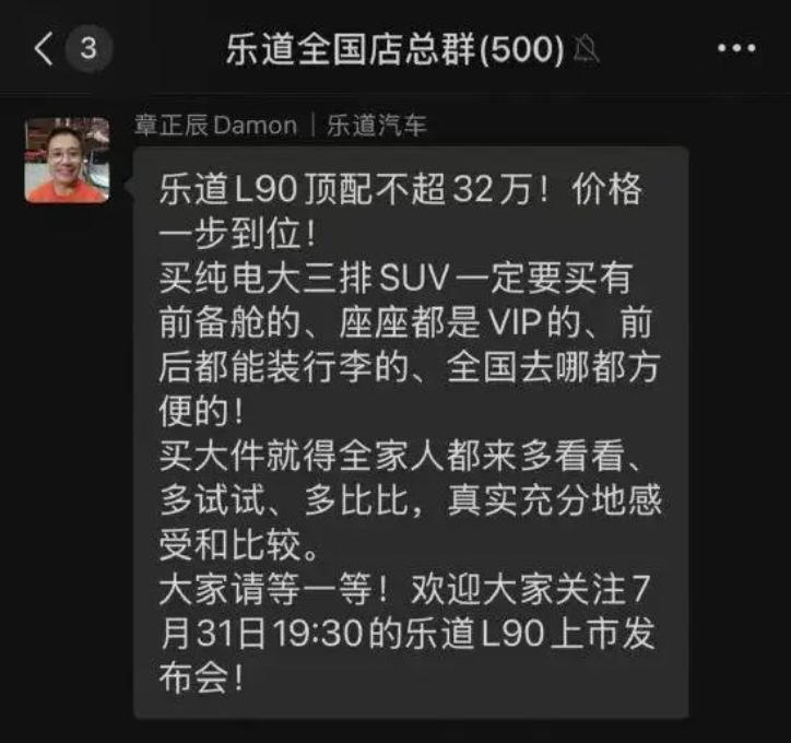 就在理想i8上市后,樂道汽車銷售負責人章正辰在樂道全國店總群中透露,樂道L90頂配不超32萬,價格一步到位。