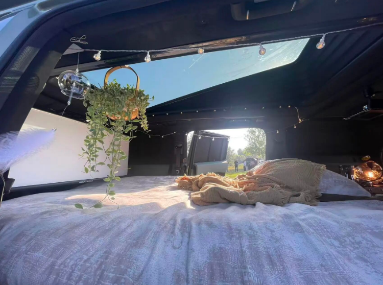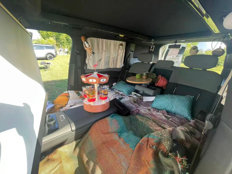 戶外過夜一直是露營體驗(yàn)的痛點(diǎn)。智趣烈馬的“一鍵成床”模式讓人印象深刻——按下按鈕,一、二排座椅在30秒內(nèi)自動放平,形成一張2米大床,且不占用后備箱空間。