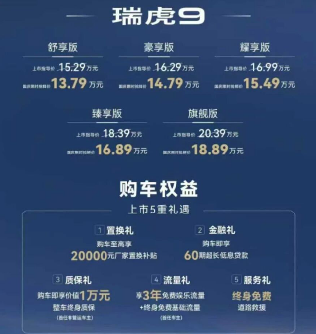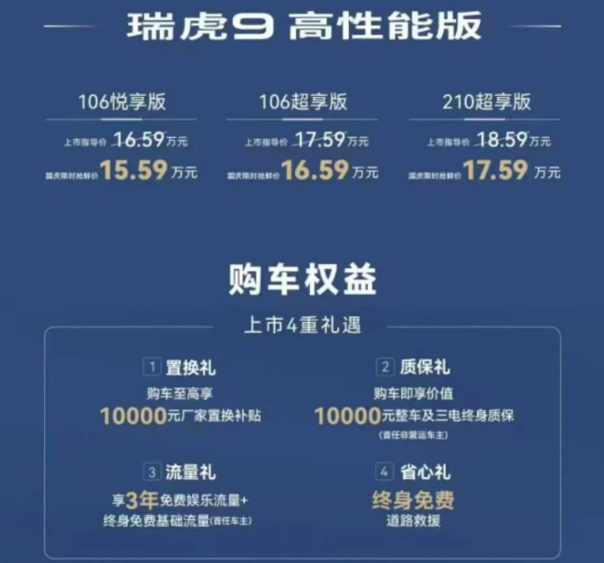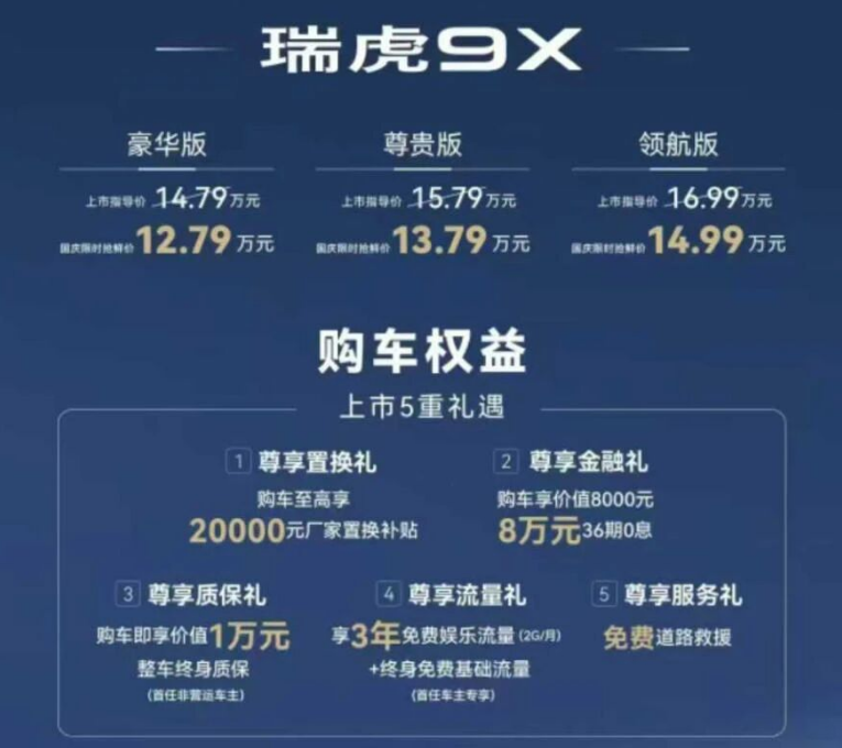 從價(jià)格區(qū)間看,瑞虎9系列的官方指導(dǎo)價(jià)從15.29萬(wàn)元起,精準(zhǔn)覆蓋了15-20萬(wàn)級(jí)SUV市場(chǎng),滿足了不同預(yù)算消費(fèi)者對(duì)高品質(zhì)燃油車的需求。值得一提的是,瑞虎家族還推出了國(guó)慶限時(shí)搶鮮價(jià)。其中瑞虎9X為12.79萬(wàn)元起,瑞虎9國(guó)慶限時(shí)搶鮮價(jià)13.79萬(wàn)元起,瑞虎9高性能版國(guó)慶限時(shí)搶鮮價(jià)15.59萬(wàn)元起。