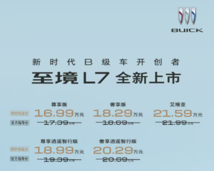9月28日,上汽通用別克品牌宣布:新能源智能豪華轎車——至境L7正式上市,共推出5款車型,限時權(quán)益價16.99萬元~21.59萬元,作為別克面對新汽車時代推出的重磅產(chǎn)品,新車把誠意直接拉滿,將純電300km的頂級真龍增程打入到17萬之內(nèi),帶激光雷達高階輔助駕駛系統(tǒng)的價格打入到18萬級,豪華大滿配的艾維亞版本用暢銷新勢力的入門版價格就能到手,至境L7是徹底打破上個時代B級車的價格體系,可以說是重塑了新時代B級車的價值標準。