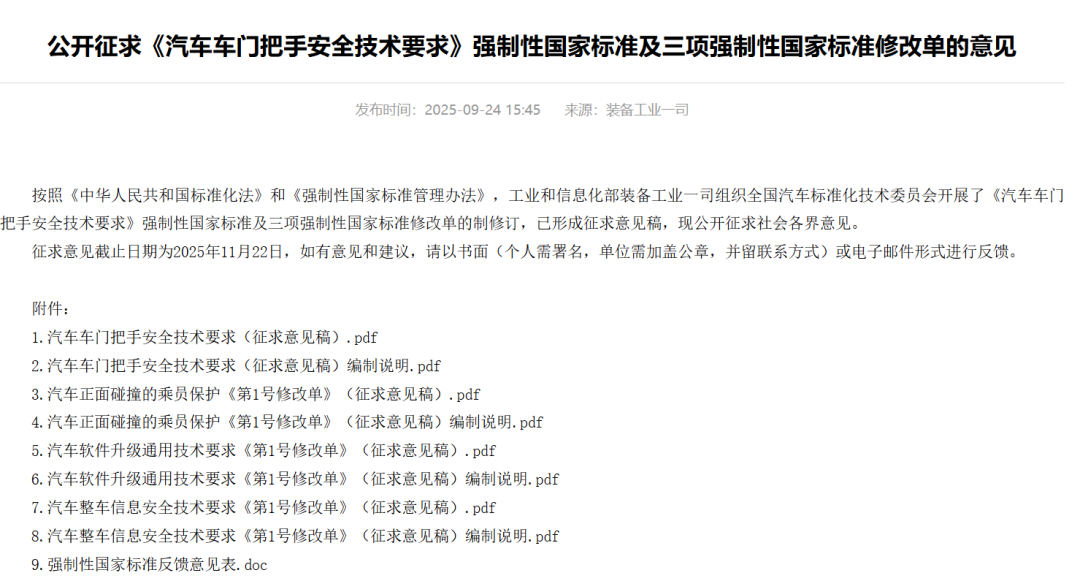 工業(yè)和信息化部裝備工業(yè)一司于近期發(fā)布通知,對《汽車車門把手安全技術(shù)要求》強制性國家標準公開征求意見。這項標準旨在解決隨著電動隱藏式車門把手普及而出現(xiàn)的安全隱患。雖然新標準還是在公開意見征集中,但是按照慣例不會有太大變化和調(diào)整。