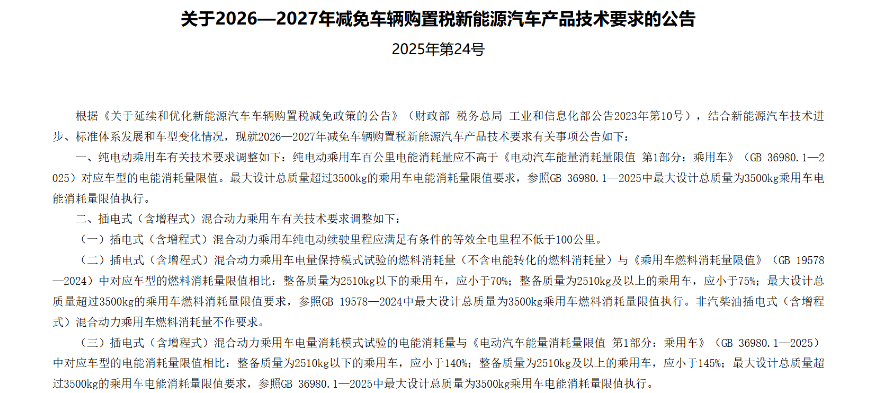 新規(guī)針對(duì)純電動(dòng)乘用車(chē)和插電式(含增程式)混合動(dòng)力乘用車(chē)的能耗、續(xù)航等技術(shù)指標(biāo)提出了更高要求,將于2026年1月1日起正式實(shí)施。