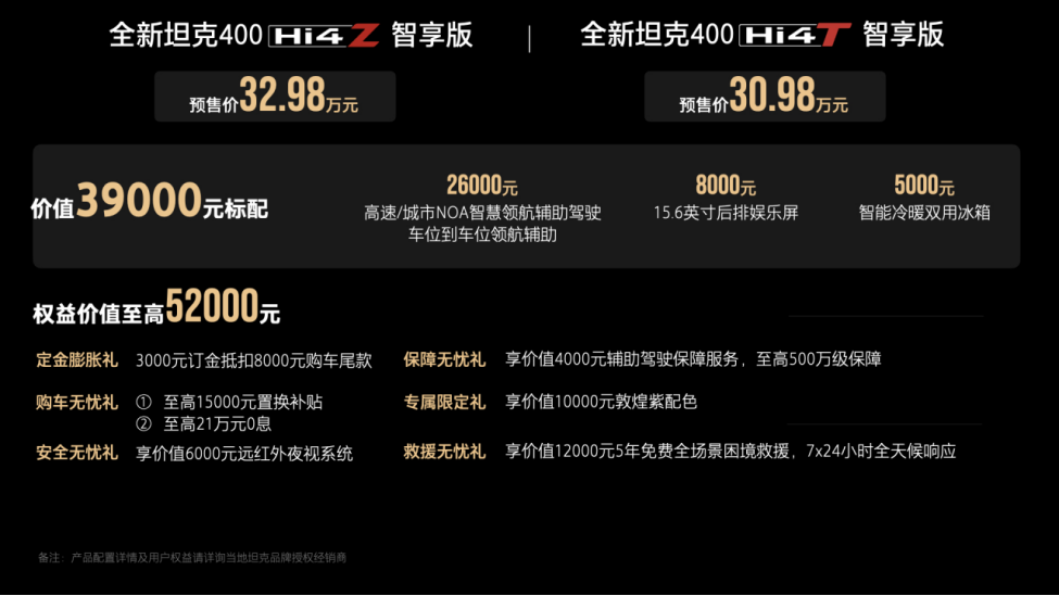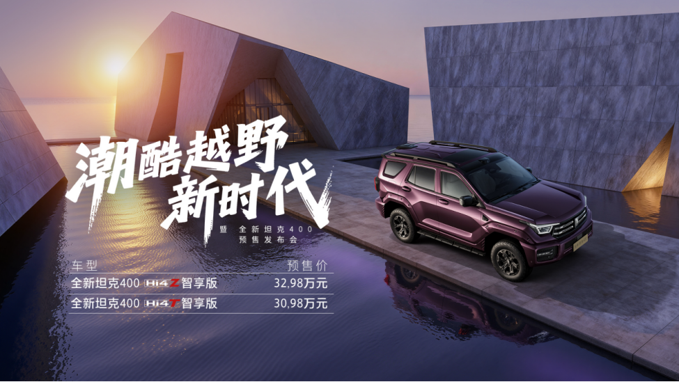 10月21日,全新坦克400以“潮酷越野新時(shí)代”為主題正式開啟預(yù)售,推出Hi4-T智享版和Hi4-Z智享版兩款配置,預(yù)售價(jià)分別為30.98萬元和32.98萬元。