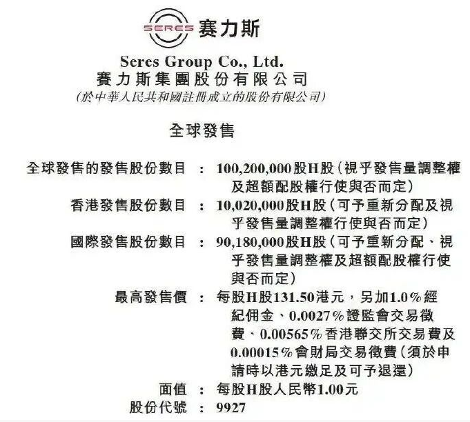 10月27日,賽力斯正式啟動(dòng)港股招股,招股期將持續(xù)至10月31日,計(jì)劃于11月5日正式以“9927”為股票代碼在港交所主板掛牌。