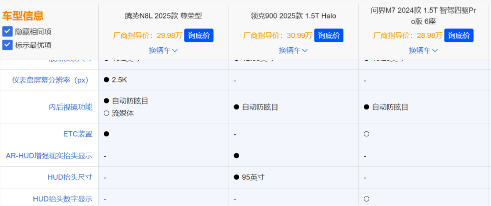 大六座、智能座艙與智駕、插混這些賣點(diǎn)也是今年大六座SUV市場(chǎng)的高頻詞匯,領(lǐng)克900和問(wèn)界M8等車型都是這樣的套路,相比之下,騰勢(shì)N8L作為后來(lái)者,其純電續(xù)航要略長(zhǎng),在價(jià)格上誠(chéng)意給的也更足,按理說(shuō)也是具備了走量的條件,但消費(fèi)者對(duì)比之后發(fā)現(xiàn),騰勢(shì)在配置搭配方面讓人有些摸不著頭腦。