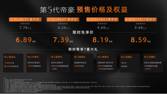 11月5日,第5代帝豪正式全球預(yù)售,共推出4款不同配置的車型,限時(shí)先享價(jià)6.89 - 8.59萬元。
