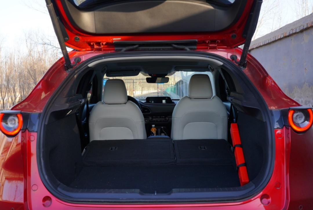 在常規(guī)狀態(tài)下,CX-30的后備箱容積達(dá)到了430L,根據(jù)實(shí)際測試,放置四五個標(biāo)準(zhǔn)紙箱和其他一些日常用品綽綽有余。同時(shí),它還支持第二排水平放倒,可以將整個后備箱容積擴(kuò)展至1432L,拉個大件、裝上整套雪具都沒有問題,從而也增加了用戶的出行廣度。