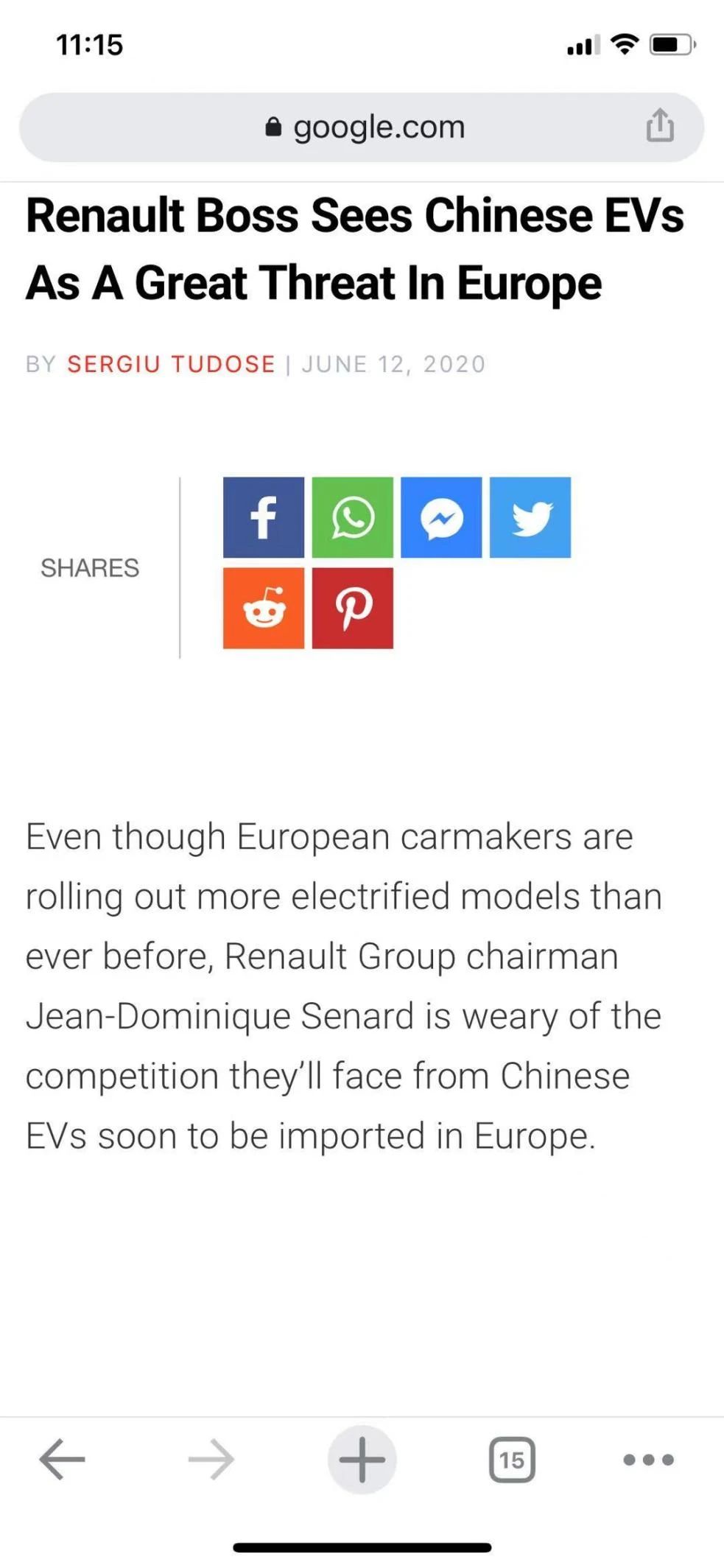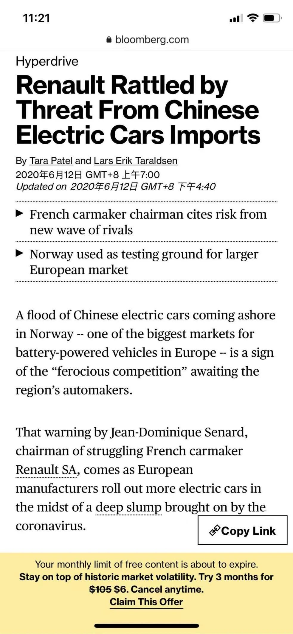 其實(shí)雷諾作為目前歐洲電動(dòng)車行業(yè)的龍頭企業(yè),早就開始了對中國純電汽車密集的調(diào)研,并把中國車企視為最大的威脅。越是龍頭企業(yè),越會(huì)打壓可能崛起的競爭對手,這就是商業(yè)社會(huì)的規(guī)律。