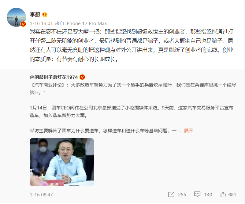 聞偉表示團車之所以決定造車,最大動力來自一個100多人的外來團隊,并介紹這個百人團隊幾乎無所不能。聞偉將造車說的如此“輕飄飄”,讓跨界造車的“過來人”——理想汽車創(chuàng)始人、董事長兼CEO李想“忍不了”,在個人社交平臺上公開回應:“那些指望能通過打開任督二脈無所能的創(chuàng)業(yè)者,最后找到的普遍都是騙子,或者大概率自己也是騙子。”