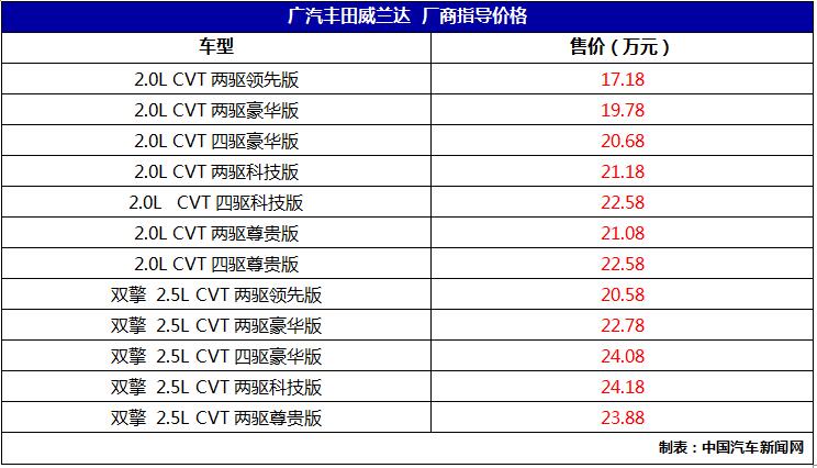 中國汽車新聞網(wǎng)訊 2月28日,廣汽豐田威蘭達(dá)在網(wǎng)上舉行上市儀式。新車全系配備自動(dòng)擋、提供兩套2.0L與2.5L雙擎兩種動(dòng)力、三種四驅(qū)形式、四大車型等級,共12款車型可選,售價(jià)17.18-24.18萬元。具體車型售價(jià)如下: