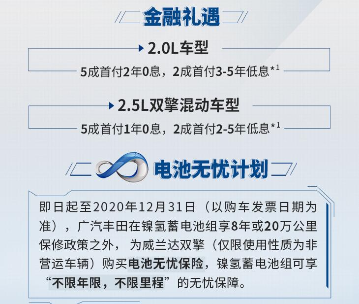 廣汽豐田還為威蘭達(dá)推出系列金融政策,包括2.0L車型5成首付2年0息、2成首付3-5年低息;2.5L雙擎混動(dòng)車型5成首付1年0息;2成首付2-5年低息;另外保有客戶增購可享價(jià)值500元增購禮。