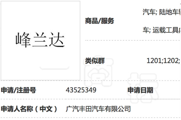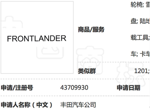 中國汽車新聞網(wǎng)訊 日前,從商標(biāo)局網(wǎng)站上看到,豐田汽車和廣汽豐田已經(jīng)注冊了“峰蘭達(dá)”和“FRONTLANDER”等中英文商標(biāo),這樣也就意味著即豐田即將有新車型要推出了,從目前的命名規(guī)則來看,或?qū)⑹且豢钊碌腟UV車型。