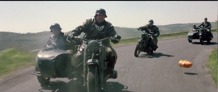 同樣是追逐片段,在法國(guó)著名喜劇演員路易·德·菲奈斯的著名影片《虎口脫險(xiǎn)》(1966年上映)中,主角們所駕駛的車輛變成了雪鐵龍黃色的民用卡車,在與德國(guó)軍隊(duì)打斗中仍南瓜的畫(huà)面則成為了法國(guó)喜劇片里的經(jīng)典片段,讓人印象深刻。